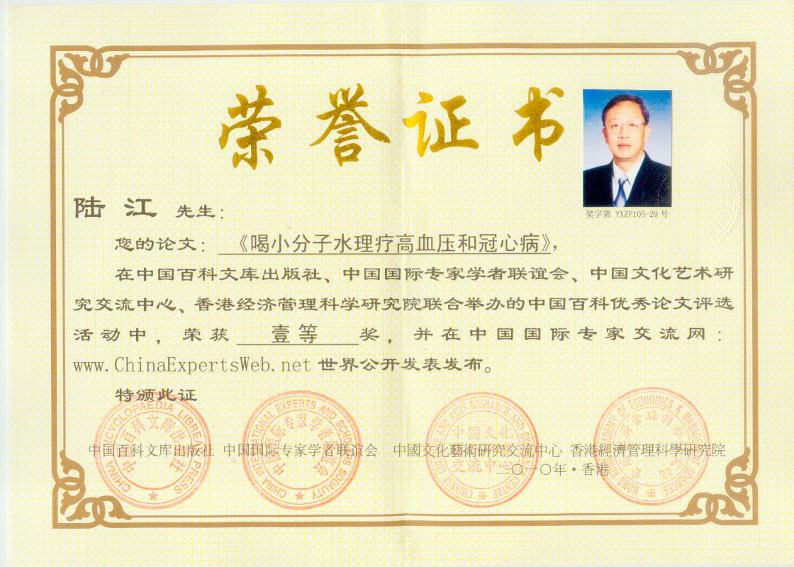 《飲用小分子水治療高血脂》獲優(yōu)秀論文獎(jiǎng)